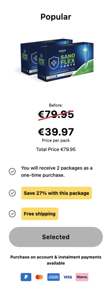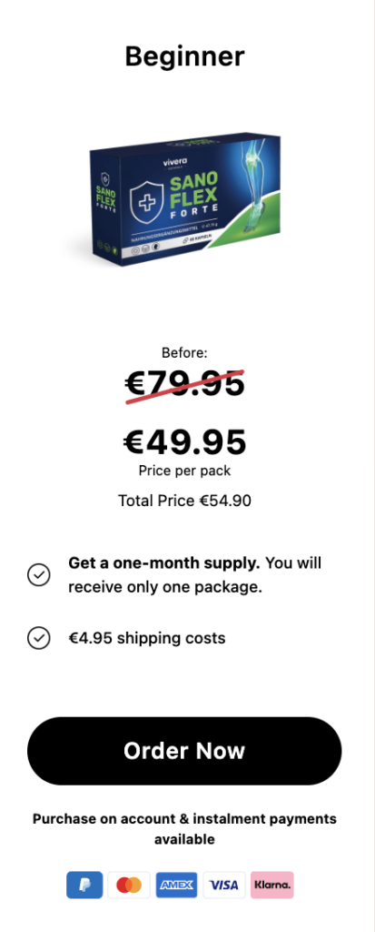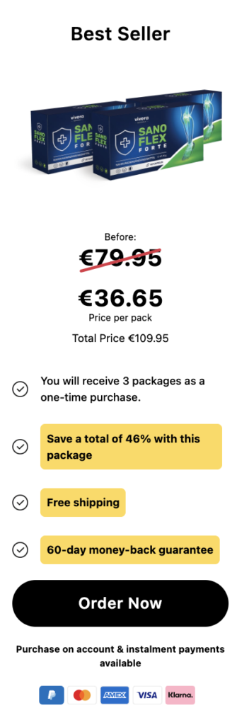 Sanoflex kombiniert wissenschaftlich geprüfte Inhaltsstoffe, die traditionell zur Unterstützung der Gelenkstruktur, Beweglichkeit und des täglichen Komforts eingesetzt werden – jetzt für kurze Zeit mit exklusivem Rabatt erhältlich.